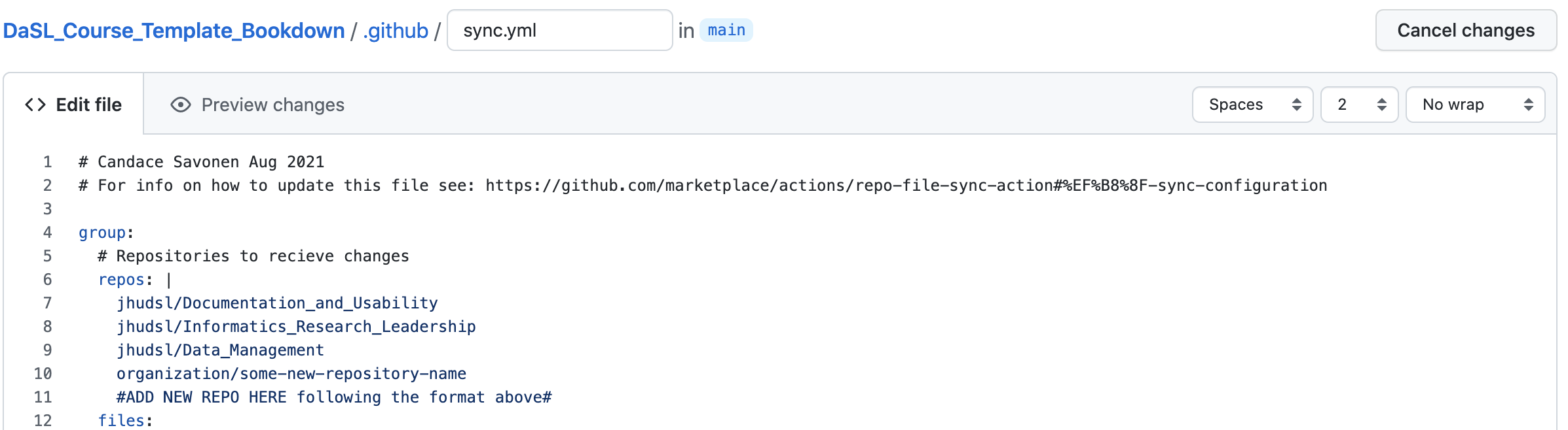 If you’re a member of the jhudsl GitHub organization, you can make edits to the sync file in a new branch and open a pull request.