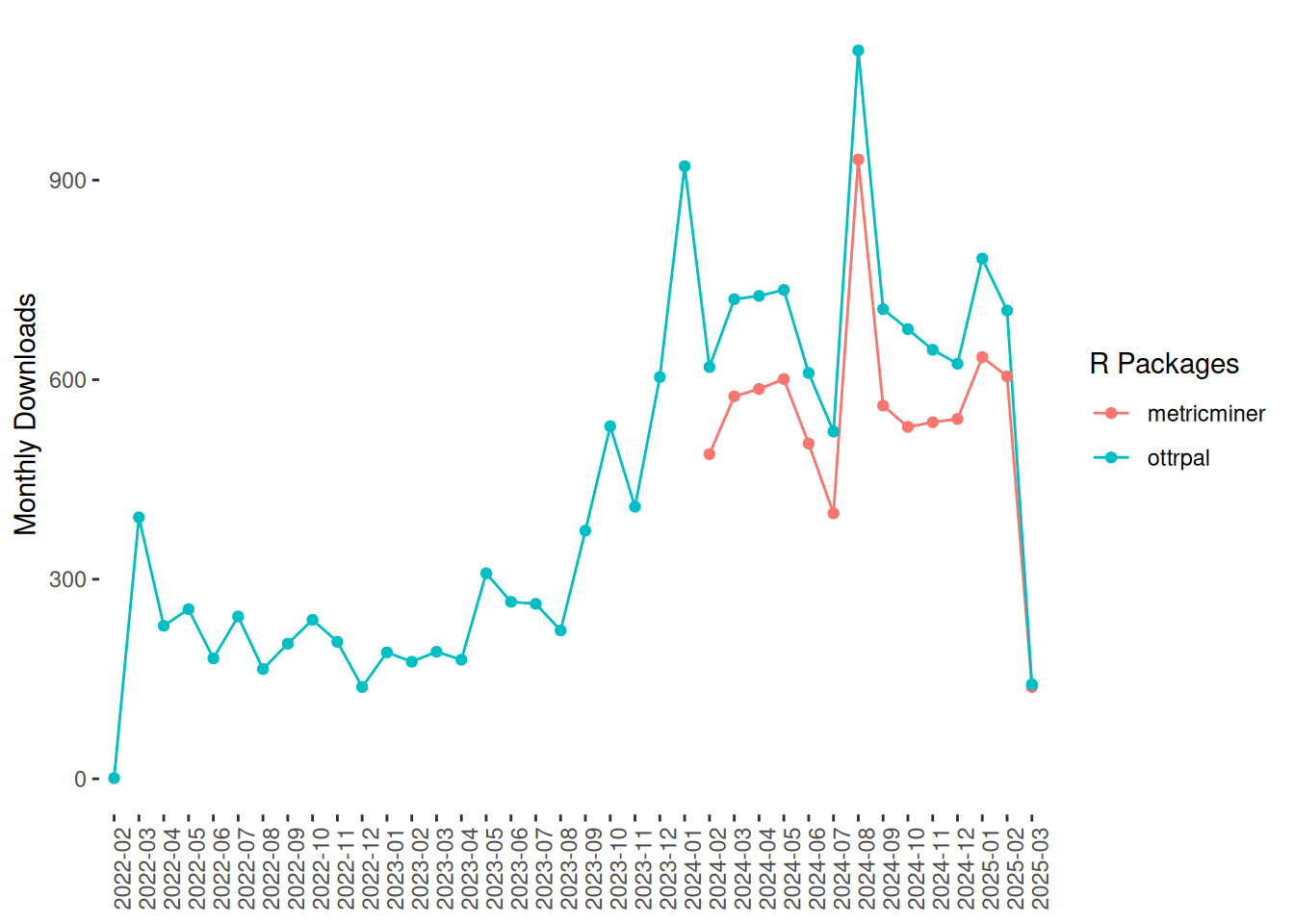summarise(monthly_downloads = sum(count)) %>% #summarize monthly downloads by package