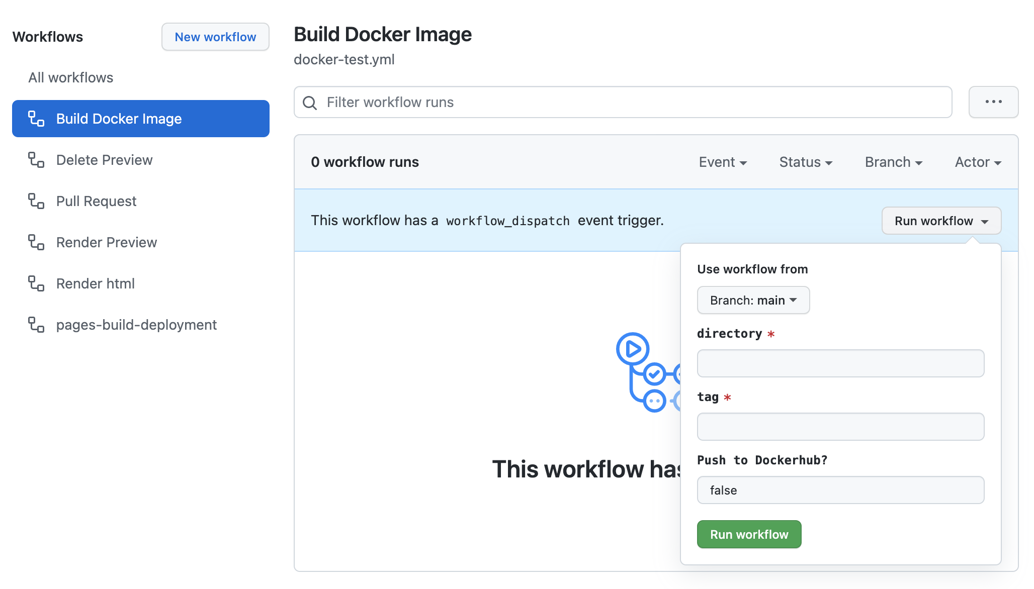 - The action linked above, as is, will only run on manual trigger and manually specifying the directory the Dockerfile is in. For having the trigger run automatically, we recommend setting up a GitHub action trigger.